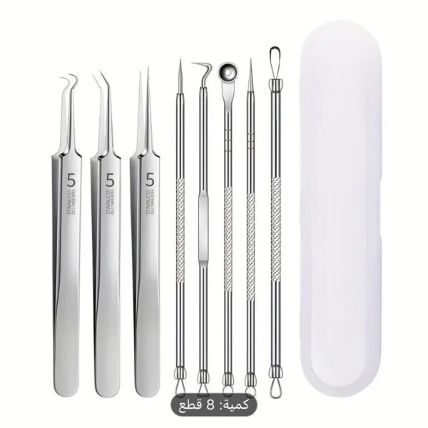 مجموعة إزالة الرؤوس السوداء المكونة من 8 قطع - أدوات استخراج البثور وحب الشباب من الفولاذ المقاوم للصدأ - مجموعة محترفة لإزالة البثور لجميع أنواع البشرة مع حافظة محمولة - أدوات العناية بالوجه غير المعطرة